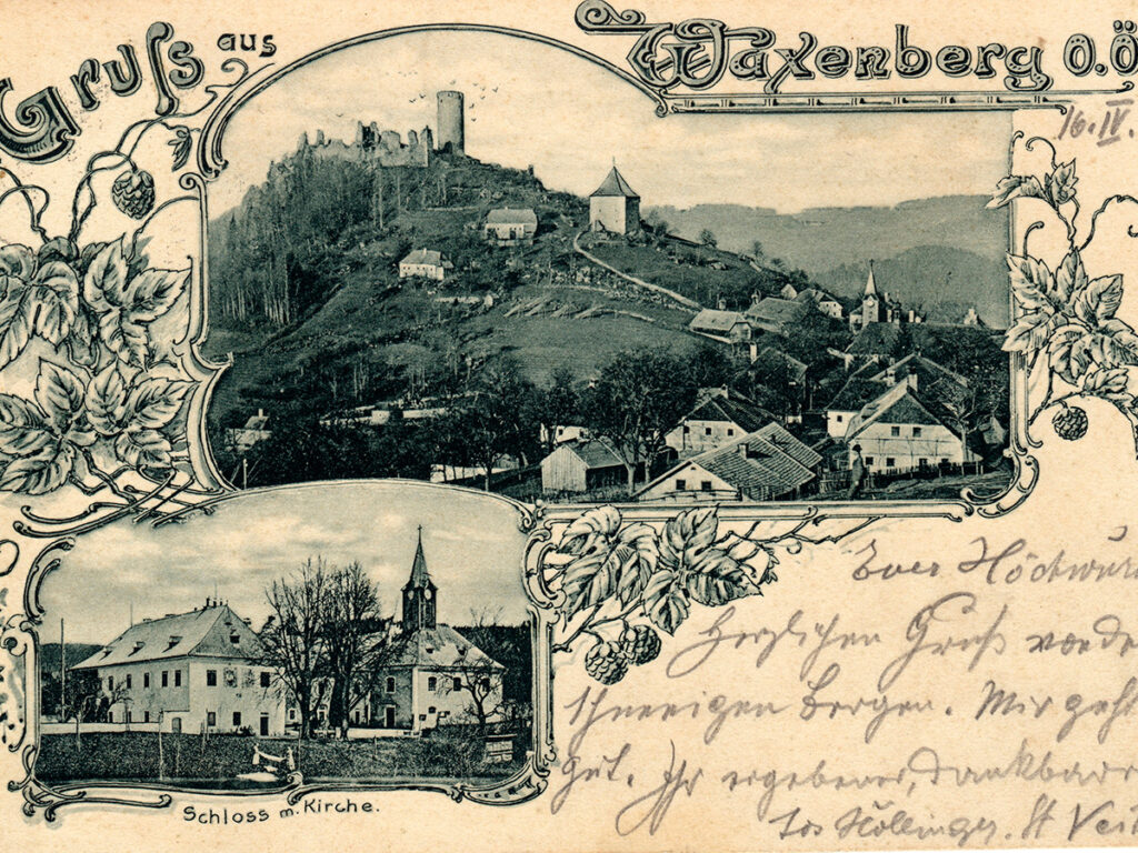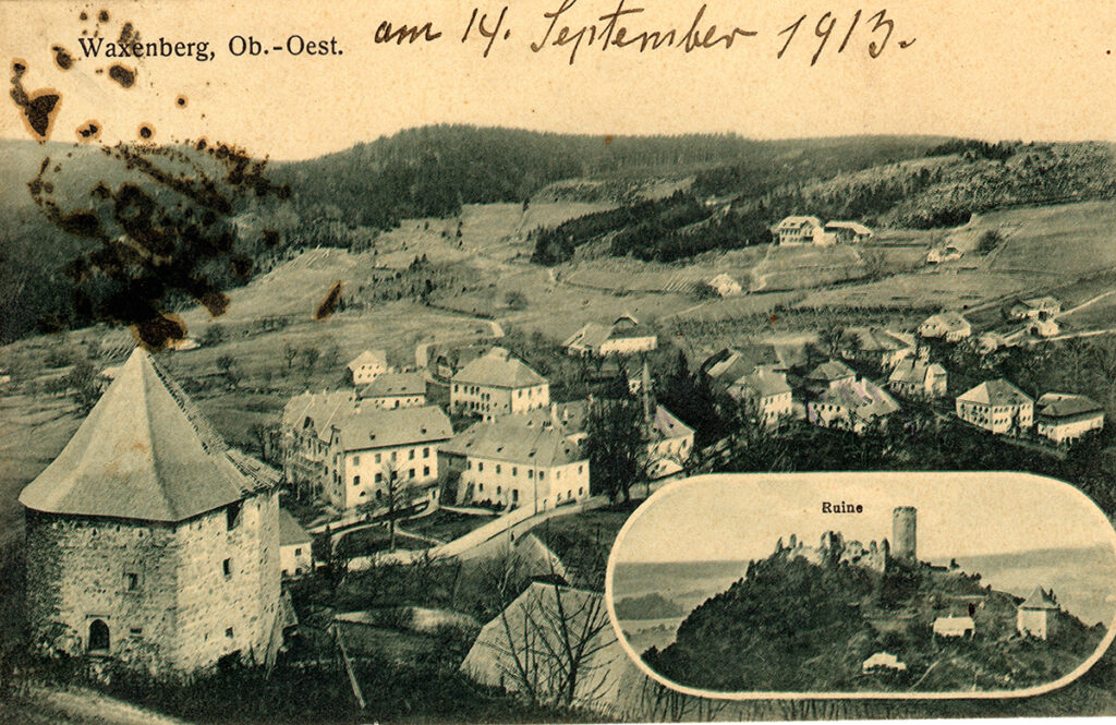 Die älteste in Waxenberg abgestempelte Karte stammt aus dem Jahr 1898 und ist eine sogenannte „Gruß-aus-Karte“. In der Pfarrchronik wird berichtet, dass am 1. Oktober 1888 im Haus Waxenberg Nr. 34 – das damals dem Fürsten Starhemberg gehörte – eine Postexpedition eingerichtet wurde. Diese unterhielt einen täglichen Botendienst von St. Veit über Waxenberg und Oberneukirchen nach Zwettl an der Rodl.